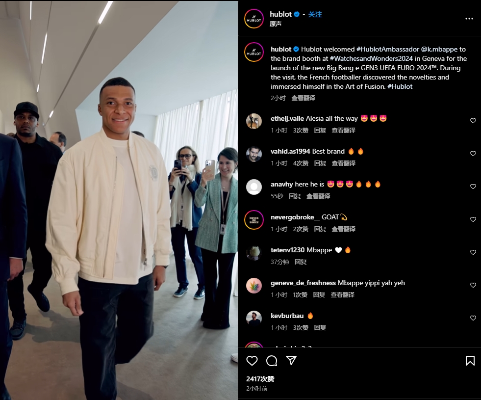 04月12日訊 在歐冠四分之一決賽第一回合輸給巴塞羅那后的第二天,姆巴佩前往瑞士日內瓦參加鐘表展。